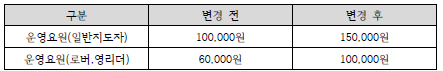 2. 행사 운영과 관련된 예산을 재검토한 결과, 부득이하게 운영요원의 참가비를 조정할 필요성이 있다고 행사 준비팀에서는 판단하였으며, 이에 대한 불가피한 변경 사항을 다음과 같이 안내드립니다.