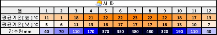 사파의 건기는 1월정도에서 6월 까지이나 산간지역에서는 오후에 소낙비가 자주 내린다. 1~2월은 가장춥고 안개가 많다. 3~5월까지는 아주 좋은 날씨가 계속되며, 6월~7월 사이에 비가 내리지만 여름은 따뜻한 편이다. 꽃이 만개하고 초월이 푸르름이 선명한 4~5월과 9~12월 중순까지도 사파를 여행하기 가장좋은 시기 이다. 사파의 여름은 4월부터 시작하지만 우기는 6월에서 9월까지다. 가을은 9월부터 시작되고 최고의 계절은 10월이다. 12월부터 겨울이 시작된다. 10월부터가 4월까지가 건기 이지만 겨우내 안개로 인해 습도가 높고 쌀쌀하다. 3월.4월은 따뜻하고 맑은 날씨다.