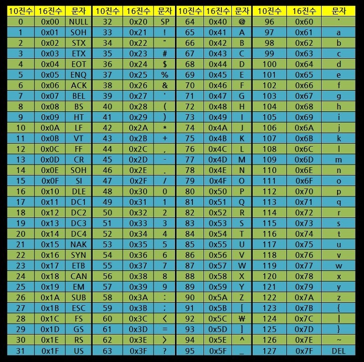 위의 아스키코드표를 보시면 마지막 번호가 127번으로 끝나는게 보이시죠? 즉 영문자의 대문자와 소문자, 문장 기호, 특수 문자를 다 합쳐도 127개면 충분하다는 것입니다.