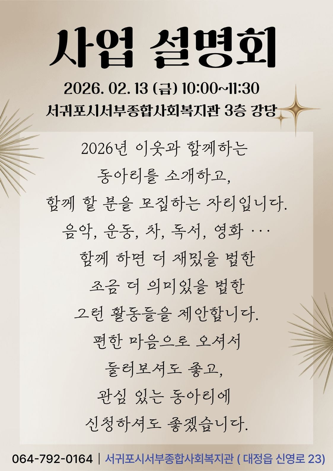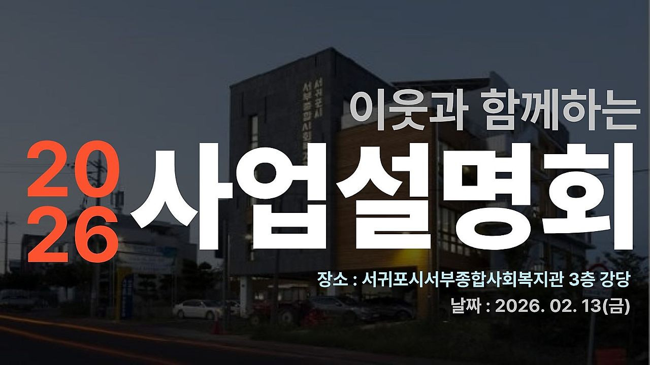 작성자김동찬 작성시간 26.02.24 이영주 선생님, '이웃이 많아지는 세상을 꿈꿉니다.' 서귀포시서부종합사회복지관 놀라운 실천 이야기를 신혜교 부장님께 듣고 있습니다. 전 직원이 한 뜻으로 공부하고 실천하는 복지관, 참 멋있습니다. 2026년 박람회 형식 사업설명회 근사합니다. 소식 올려 주셔서 고맙습니다.