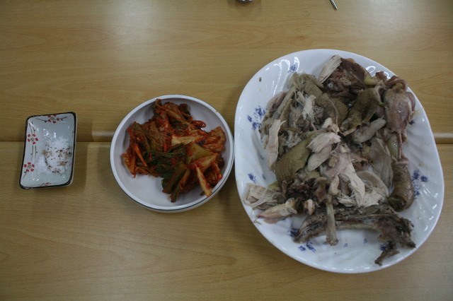 상차림은 아주 간단했습니다. 백숙, 직적담근 김치, 소금.