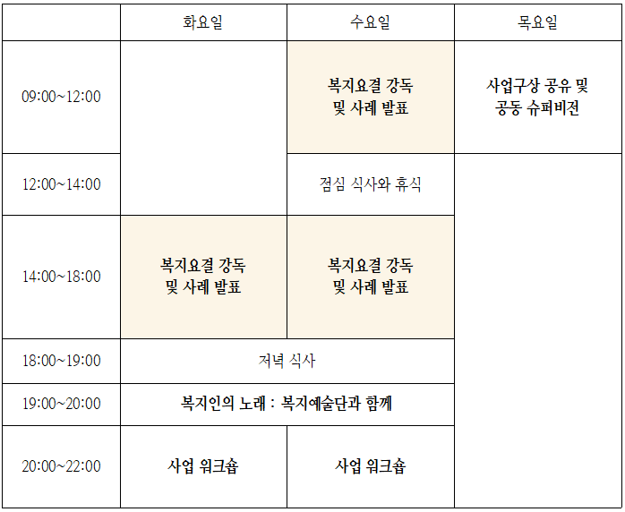 인원 : 시설 단기사회사업팀, 복지관 단기사회사업팀, 시골사회사업팀 100명