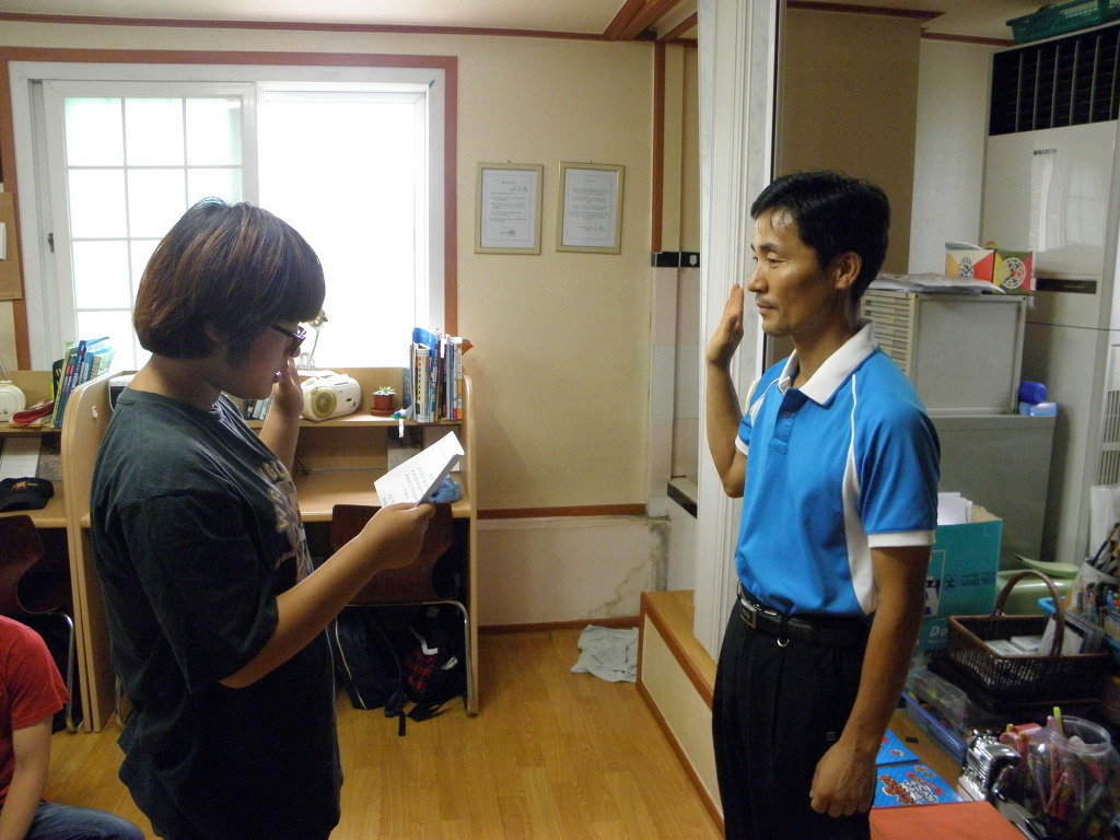 오늘은 본격적으로 여름학교를 시작하는 날이다. 가장 큰 설명회를 끝내고 나니 입학식 준비는 한결 순조로웠다. 사실 준비 할 것이 설명회에 비해서 많이 적었다. 입학식을 하면서 학생들과 선생님들이 지켜야 할 내용을 윤병오 선생님 앞에서 선서를 함으로써 꼭 지키겠다는 다짐을 선생님들 사이에서 했다. 또한 윤병오선생님는 공부방아이들에게 목표도 만들어주었다. 아이들이 모두다 목표를 만들었으니 목표를 향해 열심히 노력을 하면 되겠다. 우리는 그 목표를 이루기 위해서 열심히 도와주어야 할 것 같다. 학습 뿐만 아니라 오후프로그램을 진행할 때도 항상 프로그램의 주인은 아이들이 되어야 한다는 것을 또 생각하고 생각했다.