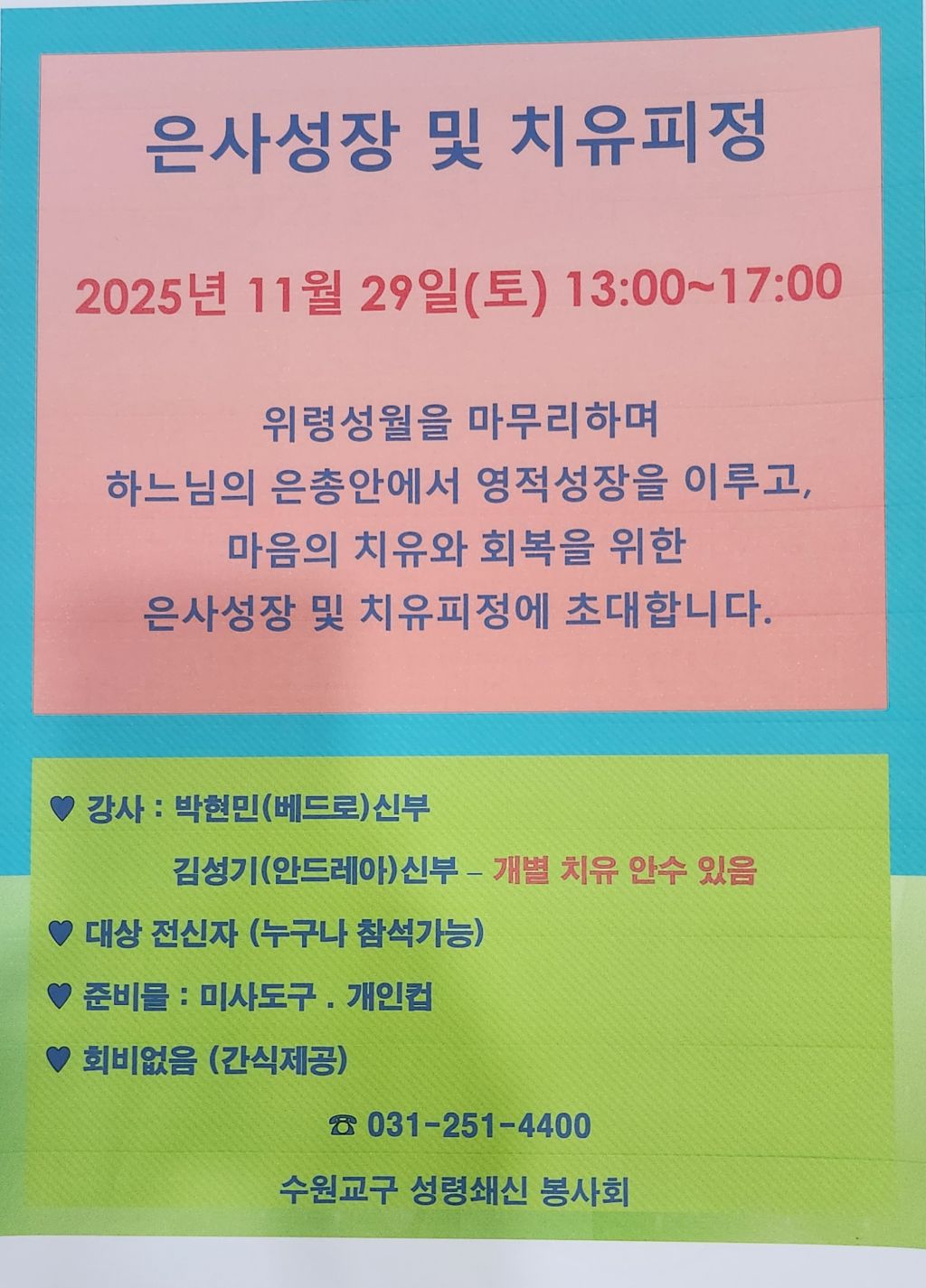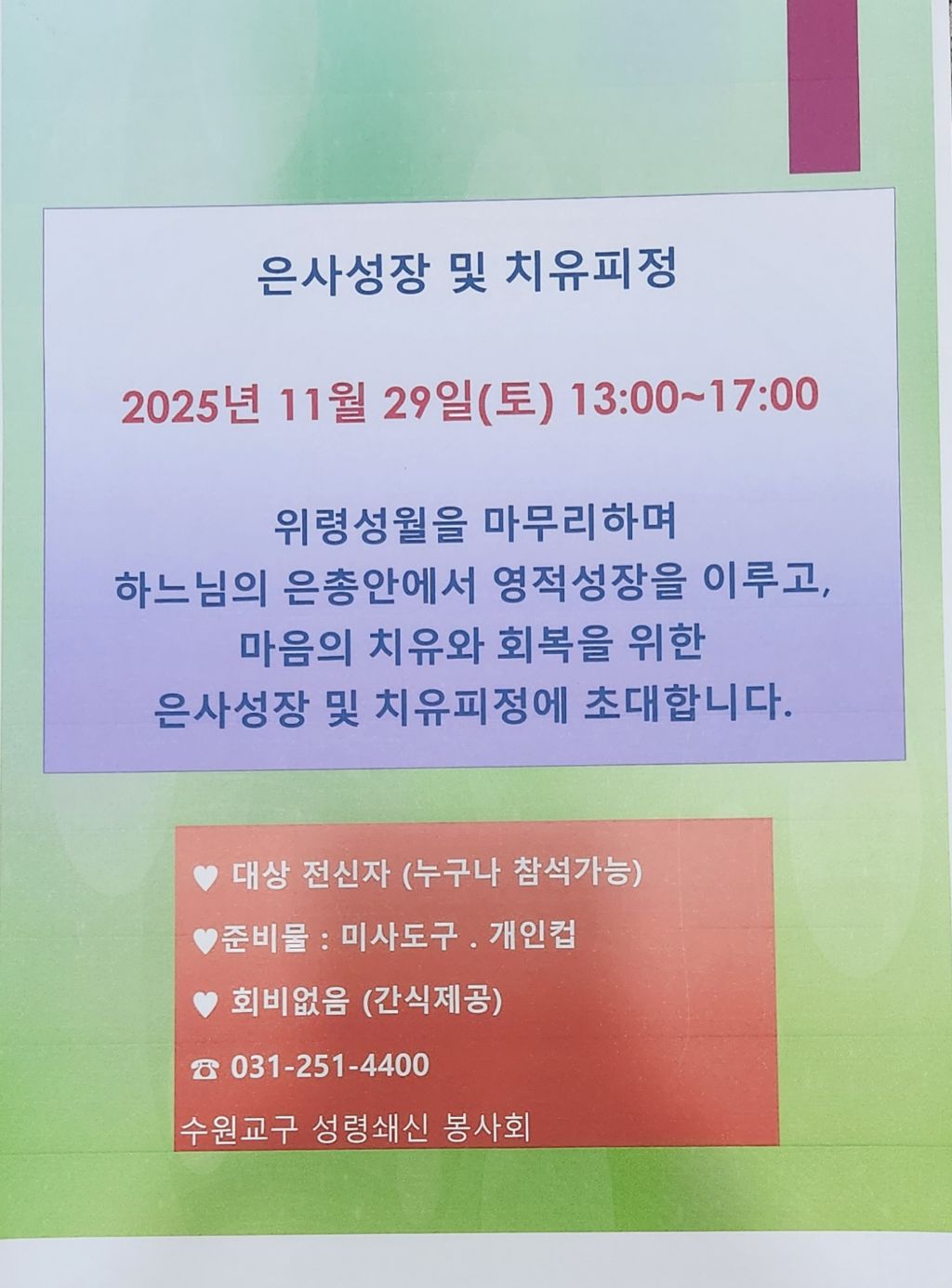 은사성장및 치유피정(2025년 11월) 작성자클라우디아|작성시간25.11.07|조회수140 목록 댓글 1 글자크기 작게가 글자크기 크게가 다음검색 현재 게시글 추가 기능 열기 북마크 공유하기 신고 센터로 신고 댓글 댓글 1 댓글쓰기 답글쓰기 댓글 리스트 작성자하늘바다 | 작성시간 25.11.16 은총 받을 기회 주셔서 감사합니다~^^ 댓글 전체보기