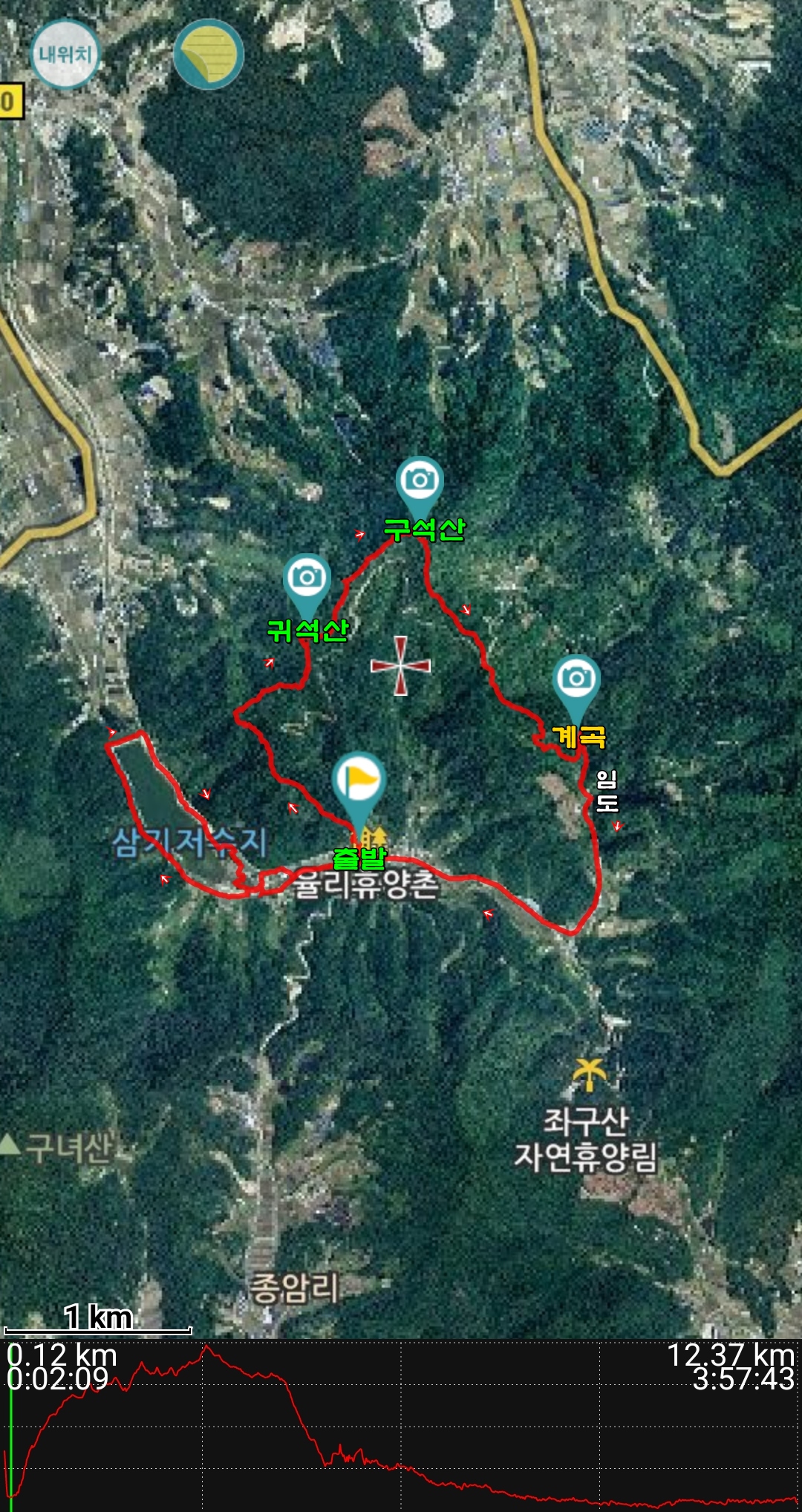 구석산 -> 임도 -> 칡넝쿨 길 -> 계곡 -> 율리유래비 -> 삼기저수지 둘레길 -> 별천지 주차장