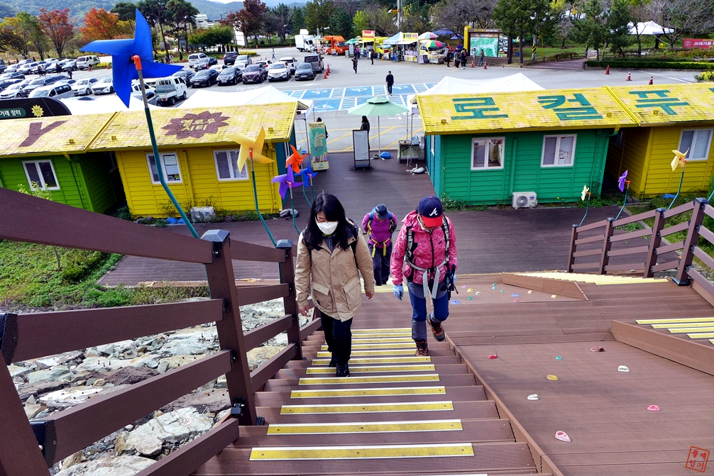 산행 코스: 주차장 -> 매표소 -> 옐로우출렁다리 -> 황금빛출렁다리 -> 풍차와호수 식당 -> 수성황토방민박 -> 성미산 -> 임도 -> 주차장