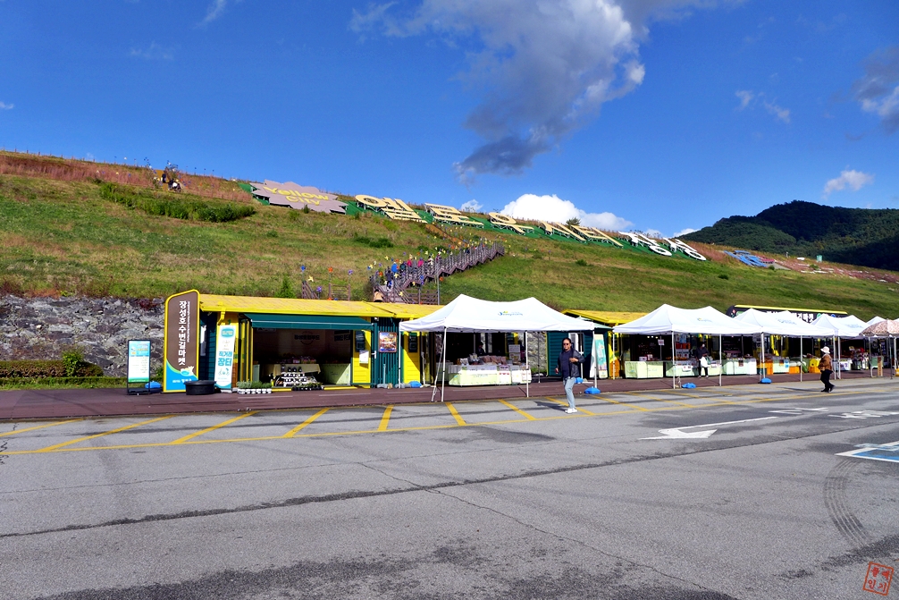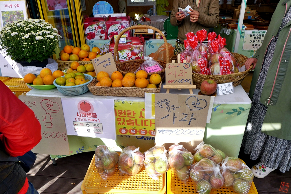 매표소에서 받은 지역 상품권으로 사과즙을 구입하다.