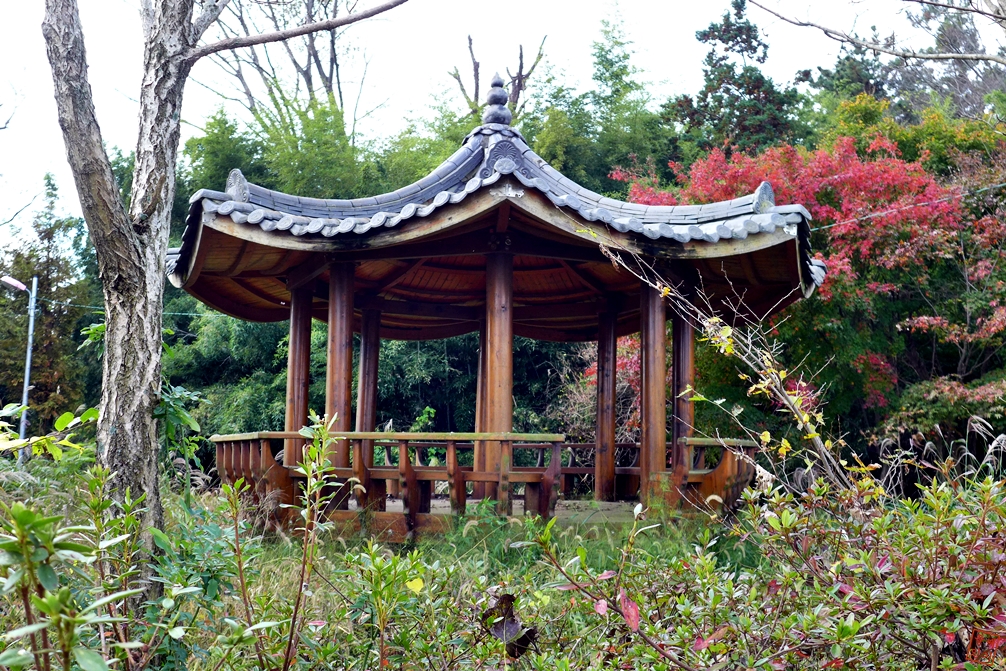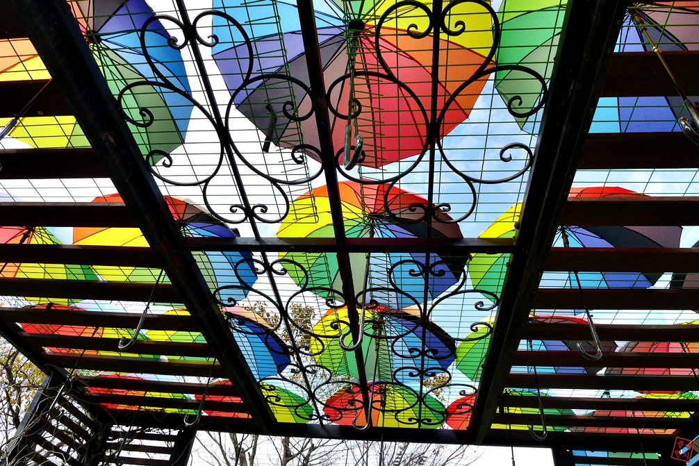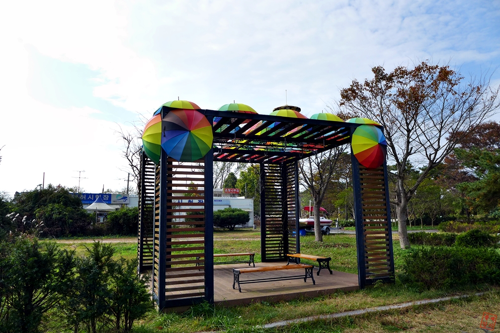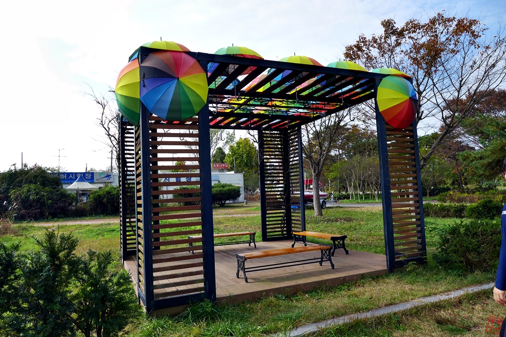 벤치 지붕위에 무지개빛 우산이 인상적이다.