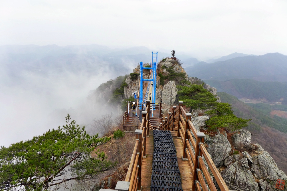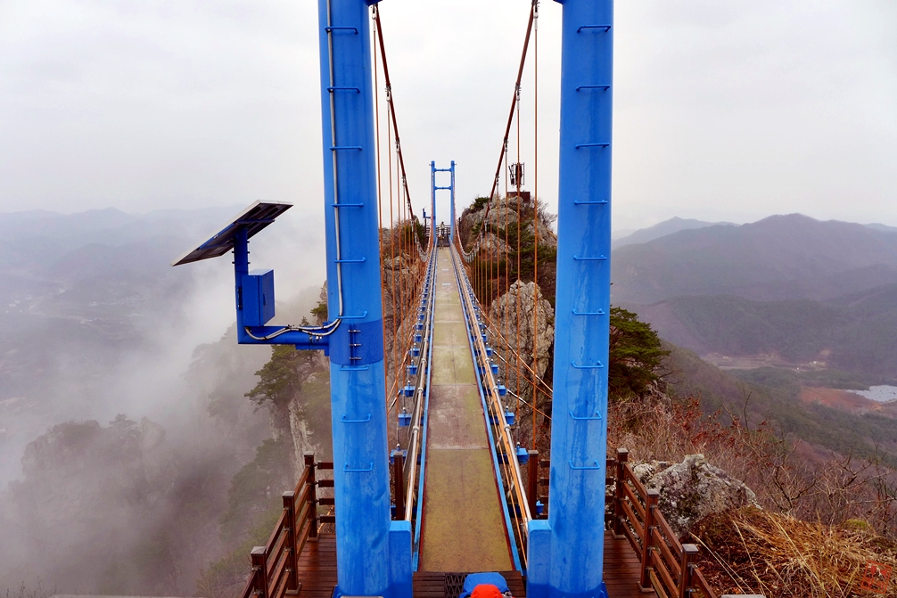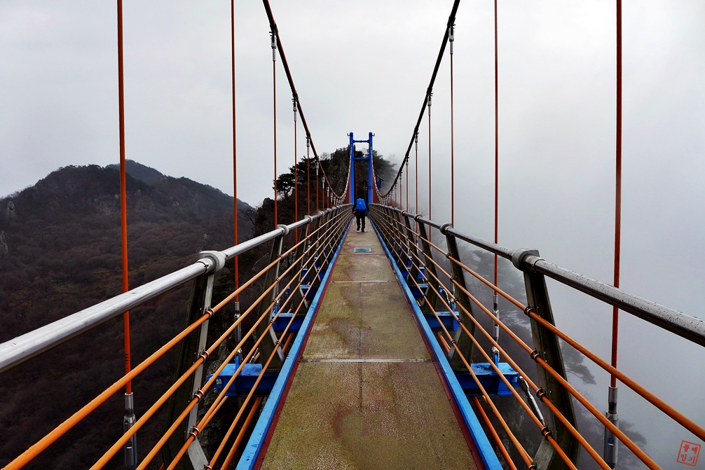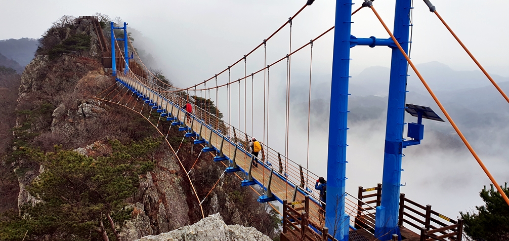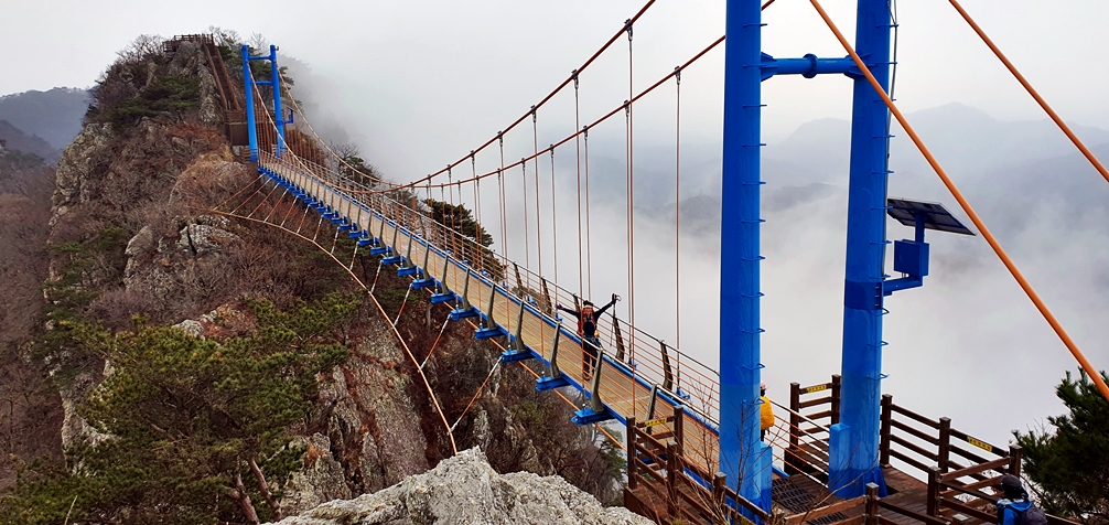 구름에 뒤덮였다가 다시 걷히는 신비로운 하늘다리.