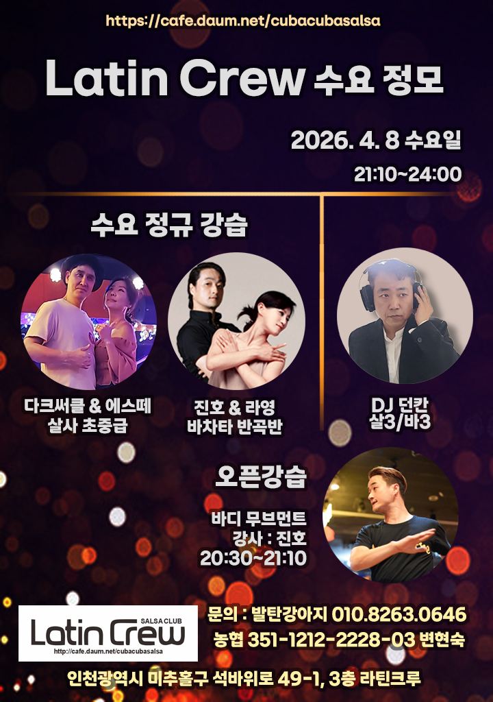 [수요정모]2026.4.8 라틴크루 수요 정모 작성자김진호|작성시간26.04.06|조회수84 목록 댓글 0 글자크기 작게가 글자크기 크게가 바차타 반곡반 개강과 함께 하는 라틴 크루 정모함께 해요~ 다음검색 현재 게시글 추가 기능 열기 북마크 공유하기 신고 센터로 신고 댓글 댓글 0 댓글쓰기 답글쓰기 댓글 리스트