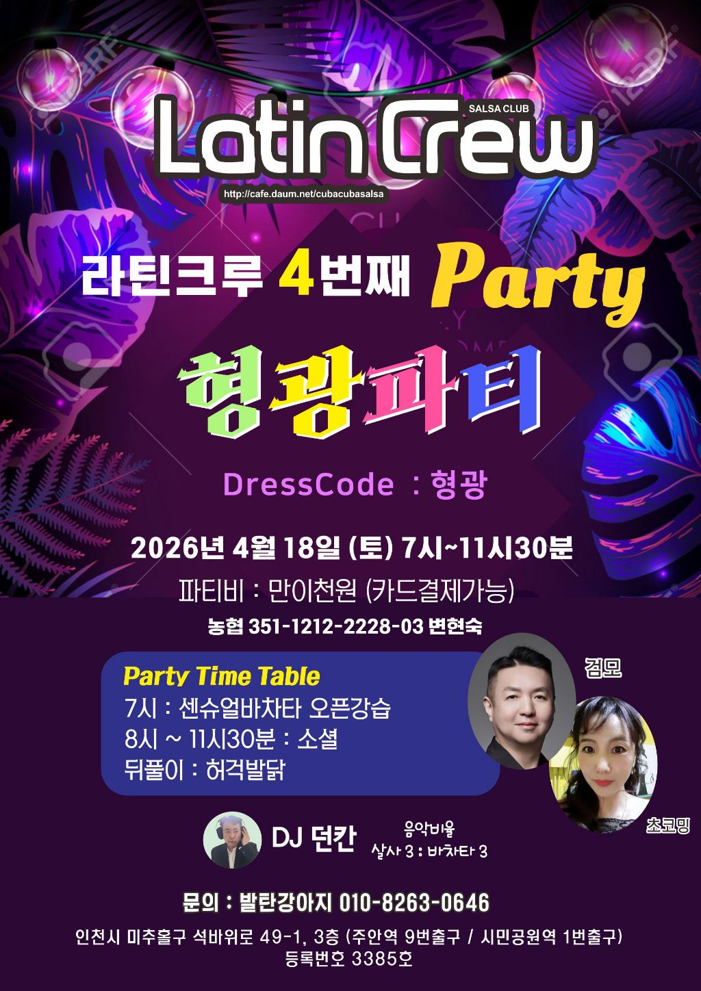[파티][인천살사라틴크루]2026년 4번째 형광파티 작성자발탄강아지|작성시간26.04.04|조회수124 목록 댓글 2 글자크기 작게가 글자크기 크게가 2026년 4월 18일(토요일) pm 7시센슈얼바차타 오픈강습 검모&초코밍 8시~11시30분 즐거운 파튀~~~ 다음검색 현재 게시글 추가 기능 열기 북마크 공유하기 신고 센터로 신고 댓글 댓글 2 댓글쓰기 답글쓰기 댓글 리스트 작성자발탄강아지 작성자 본인 여부 작성자 | 작성시간 26.04.08 1.발탄강아지2.던칸3.진호4.시크5.수제비6.다크써클7.에스떼8.이글9.프천10.미추홀 작성자발탄강아지 작성자 본인 여부 작성자 | 작성시간 26.04.08 11.검모12.초코밍 댓글 전체보기