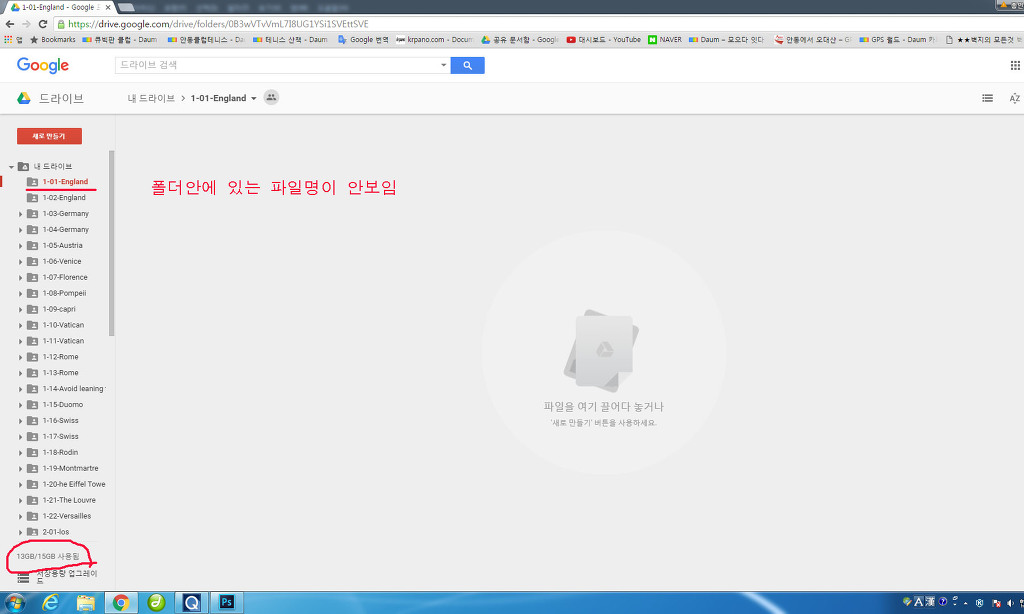 또 다른 계정의 드라이브인데 왼쪽 폴더명을 클릭하면 오른쪽에 파일명이 보이지를 않습니다.