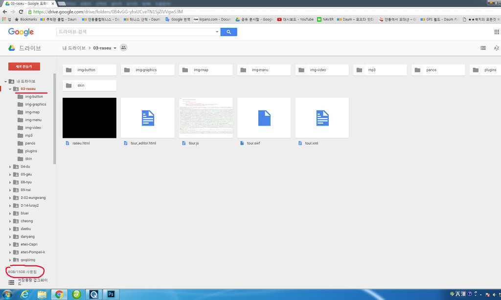 왼쪽에 폴더명이 있고 이 폴더명에는 오른쪽과 같이 각종 파일들이 들어있고 왼쪽 아래를 보면 전체 15G중 8G를 사용했다라는 표시가 되어 있습니다.