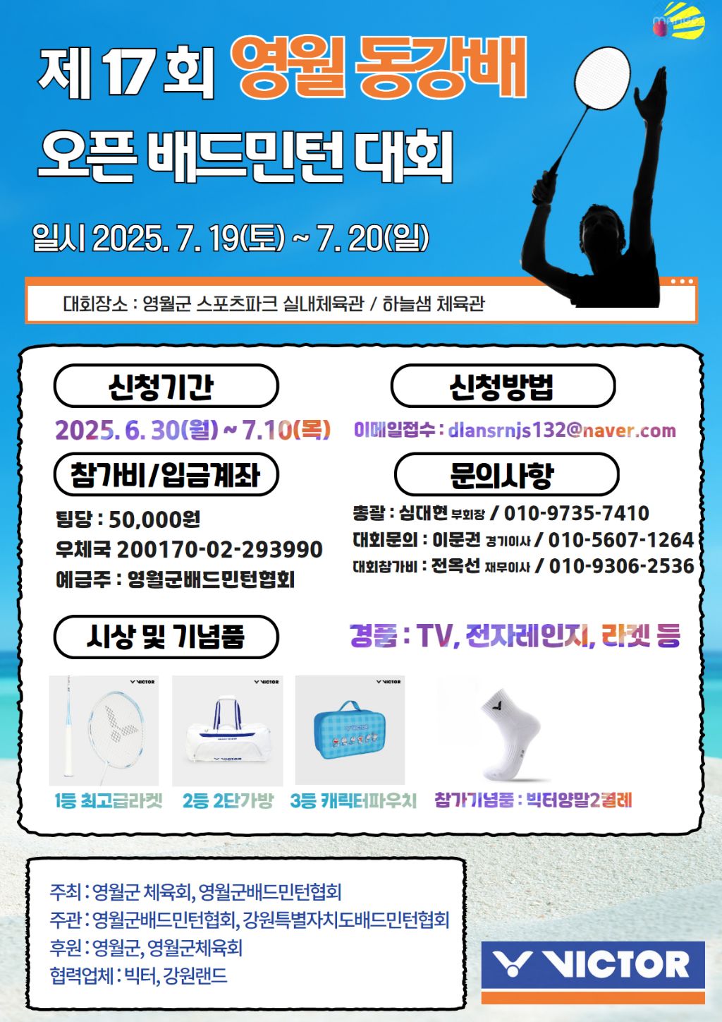 2025년 제17회 영월동강배 오픈 배드민턴대회 요강 작성자영월/영월/전옥선|작성시간25.06.30|조회수228 목록 댓글 3 글자크기 작게가 글자크기 크게가 2025 동강배 대회요강 최종_2025_06_30_21_02_46.hwp65.00KB 영월동강배 배드민턴대회 참가신청서_2025_06_30_21_02_35.xls62.50KB 첨부파일첨부된 파일이 3개 있습니다. hwp 파일 2025 동강배 대회요강 최종_2025_06_30_21_02_46.hwp 다운로드 xls 파일 영월동강배 배드민턴대회 참가신청서_2025_06_30_21_02_35.xls 다운로드 jpg 파일 resized_1751428600683.jpg 다운로드 다음검색 현재 게시글 추가 기능 열기 북마크 공유하기 신고 센터로 신고 댓글 댓글 3 댓글쓰기 답글쓰기 댓글 리스트 작성자영월/영월/전옥선 작성자 본인 여부 작성자 | 작성시간 25.07.11 추가 접수 받습니다~2025.7.11.(금) 19시 까지 입니다 작성자영월/영월/전옥선 작성자 본인 여부 작성자 | 작성시간 25.07.12 영월동강배 2025.7.12.(토) 19시 까지 추가접수 받습니다. 작성자꼬꼬미 | 작성시간 25.07.16 대진은 언제 나오나요? 댓글 전체보기