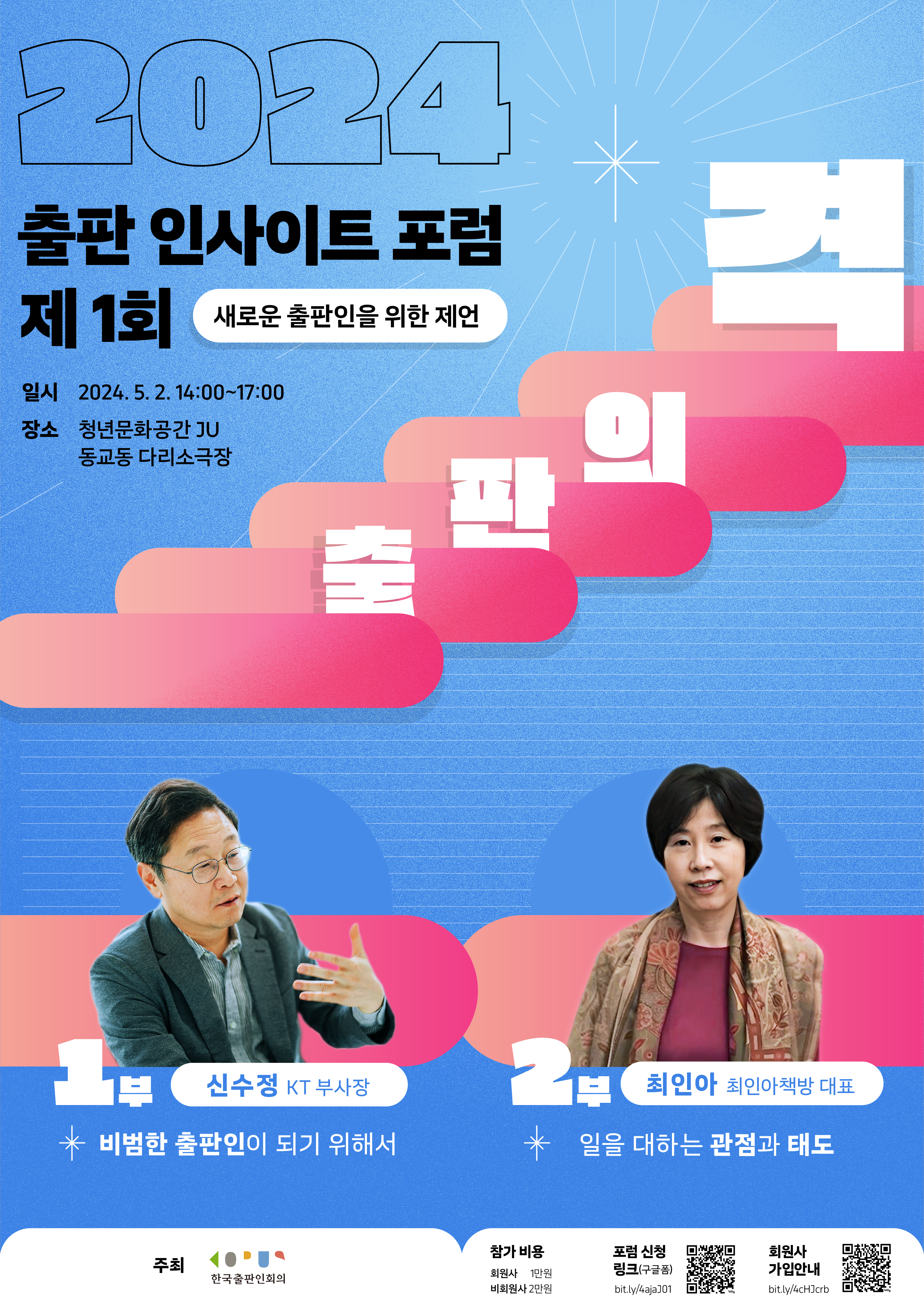 - 신 청 온라인 신청(구글 폼 : bit.ly/4ajaJ01) → 참가비 결제 1. 카드 결제(kopus.cafe24.com) 혹은 2.무통장 입금 (신한은행 140-004-180290 (사)한국출판인회의)