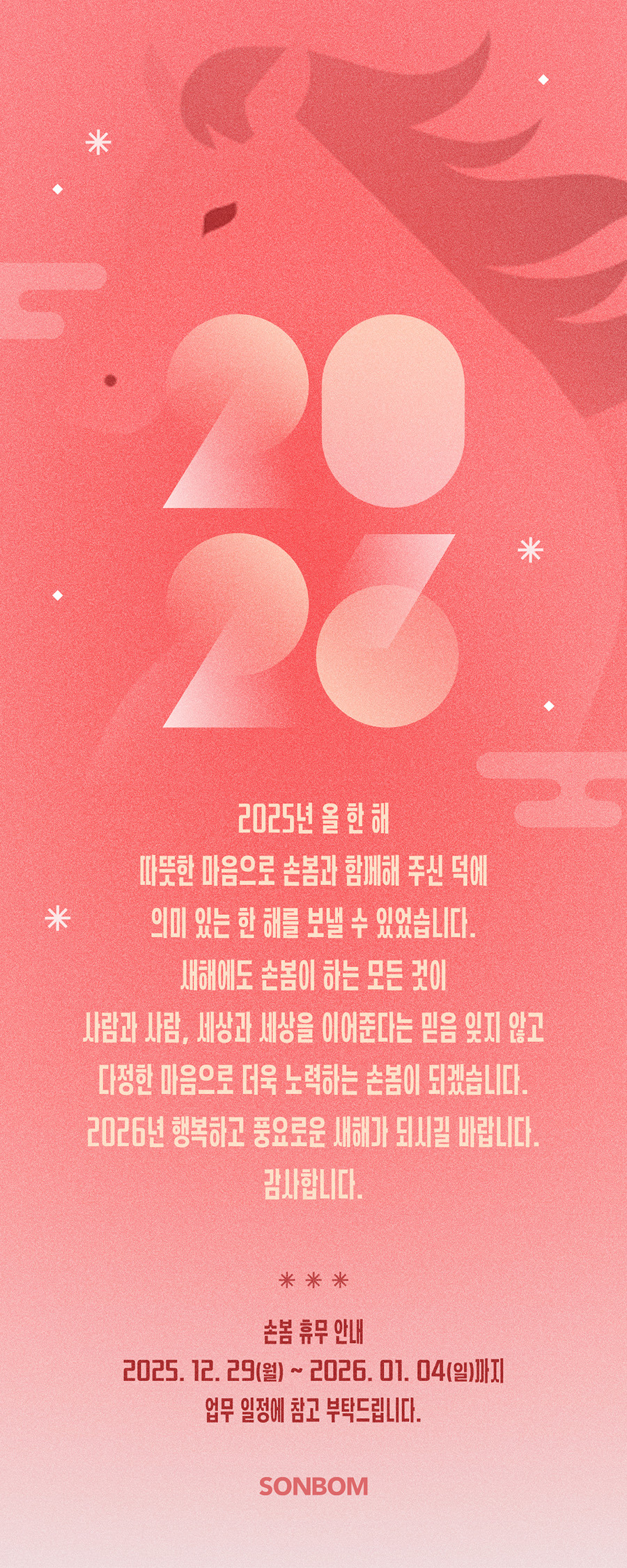 2025년 한 해 감사드리며, 2026년 새해 복 많이 받으세요! 작성자김효석(손봄)|작성시간25.12.24|조회수9 목록 댓글 0 글자크기 작게가 글자크기 크게가 다음검색 현재 게시글 추가 기능 열기 북마크 공유하기 신고 센터로 신고 댓글 댓글 0 댓글쓰기 답글쓰기 댓글 리스트