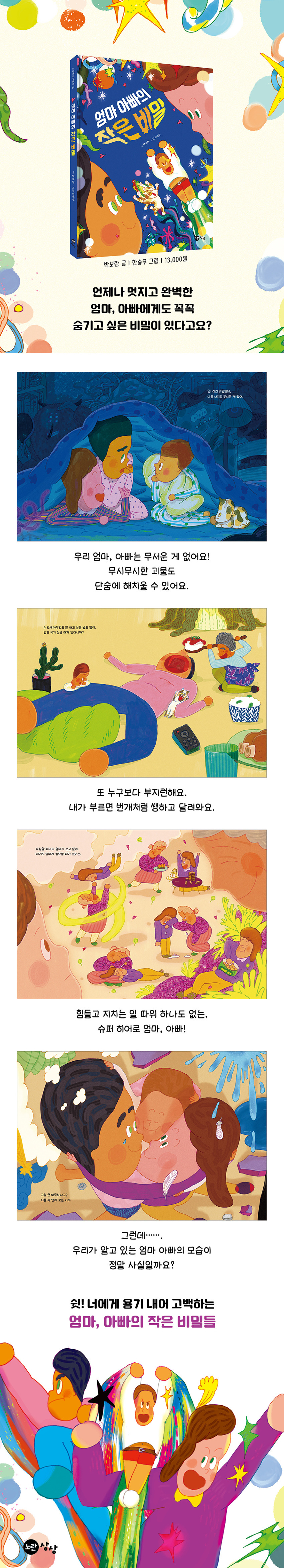 노란상상의 신간 <엄마 아빠의 작은 비밀>은 그렇기에 더 아름다운 엄마, 아빠를 응원하기 위해 만들었습니다. 꼭 아이에게 완벽할 필요는 없다고, 어깨 위에 잔뜩 올려 둔 무거운 짐들은 가끔은 내려놓는 것도 좋다고 이야기하지요.
