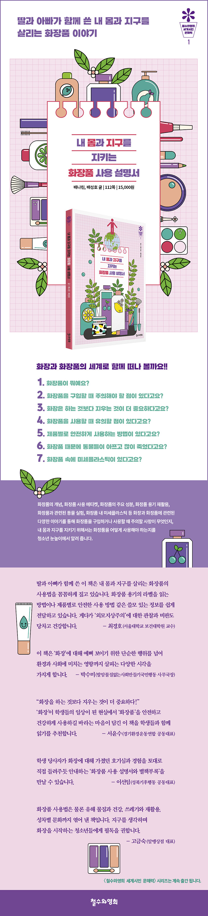 화장을 시작하게 되면서 화장품에 대해 궁금증을 품은 딸과 아빠가 함께 쓴 이 책은 화장품 용기 및 포장 겉면에는 어떤 중요한 정보가 있는지, 화장은 하는 것보다 지우는 것이 왜 중요한지, 화장품 때문에 동물들이 어떤 고통을 겪고 있는지, 화장품에 들어간 미세플라스틱이 지구와 내 몸에 어떤 영향을 미치는지, 화장품 용기는 왜 재활용이 잘 안 되는지와 같은 청소년들이 화장을 처음 시작할 때 꼭 알아야 할 화장과 화장품에 관한 이야기를 쉽게 담고 있다.