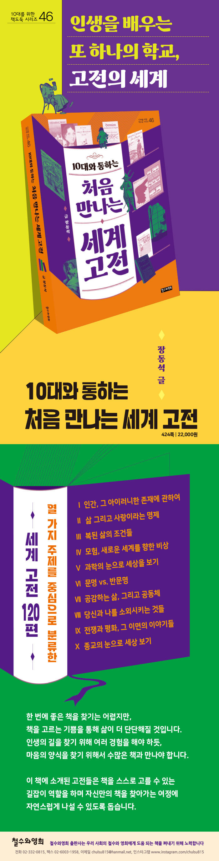 이 책은 인간, 사랑, 삶, 모험, 과학, 문명, 공동체, 소외, 평화, 종교 등 열 가지 주제를 중심으로 세계의 고전 120편을 알기 쉽게 소개하며, 청소년들이 책을 스스로 고를 수 있게 하는 길잡이 역할을 한다. 청소년들은 이 책에 소개된 고전을 통해 자신만의 책을 찾아가는 여정에 자연스럽게 나설 수 있다.