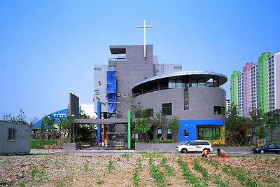 저층부와 상층부의 분리된 기능은 건물의 매스를 조직하는 데에도 표현되었다. 저층부의 경우 어린이를 위한 시설이므로 외부와 내부의 환경에 다양하게 접하는 공간이 되도록 형태가 다른 두 개의 매스로 나누어 어긋나게 배치했다. 반면 3층의 예배당은 최대한의 통합된 공간이 필요하므로 하나의 큰 매스가 얹혀지는 형상으로 하였는데, 이는 마치 지붕처럼 건물의 전체를 감싸는 역할을 하게 되었다. 건물이 여러 매스들의 조합으로 이루어짐으로써 대지가 세 방향으로 트여있고 그 너머 고층건물들로 둘러 싸여있는 특성상 조감적으로 보여지는 경우가 많음에 대응하게 되며, 거대한 건물들 사이에서 완충적인 역할도 하게 된다.