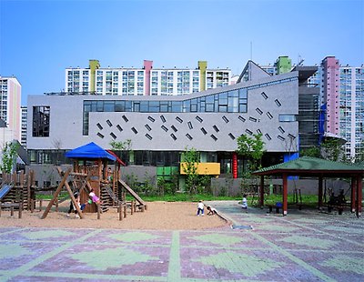 그러나 두 프로그램의 공존에 있어서 공간활용은 서로 공유되어야 하더라도 동선관계 등은 적절히 분리해주어야 한다는 과제가 남는다. 그에 대한 해결안은 대지의 특성에서 찾을 수 있었다. 북쪽엔 공원을, 남쪽엔 하천을 두고 있는 대지는 북쪽과 남쪽이 1.5m정도의 레벨차이를 보인다. 이에 각각의 레벨에 적응하는 두 개의 진입마당을 두어, 저층부와 상층부의 진입 동선을 분리하였다. 공원쪽 마당은 공원과의 연계가능성에서 어린이 시설을 위한 출입 공간으로 하였고, 하천쪽 마당은 지하 주차장 램프에 의해 버려지는 공간을 활용하기 위한 야외 스탠드를 설치함으로써 교회의 출입이나 소규모 집회를 위한 장소로 성격이 자연스레 결정되었다. 내부 동선 역시 1,2층을 위한 동선과 지하와 3층을 위한 동선이 분리되어 계획되었다.
