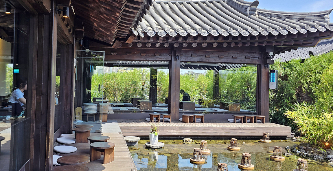 청수당은 황리단길 생활문화센터 주차장 바로 곁에 위치해 있는 도시 속 섬과 같은 비밀스러운 정원 카페입니다. 입구로 들어서면 통 창박의 연못에 바로 눈길이 가는, 한옥의 한뜰을 생각나게 하는 아웃테리어와 인테리어가 돋보입니다.