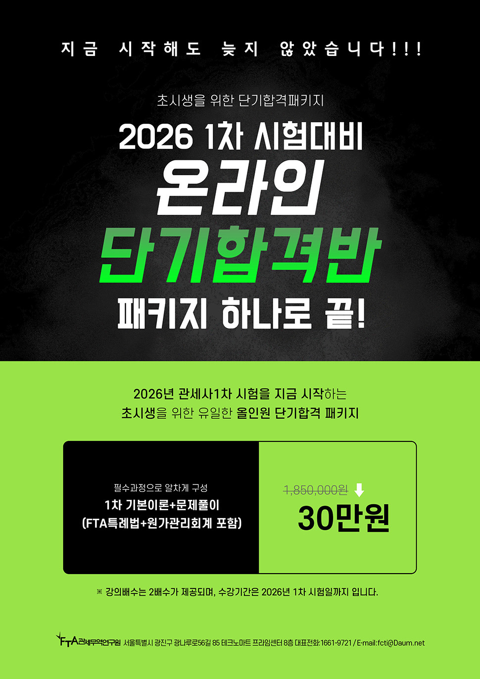 [안내] 2026년 관세사 1차시험 대비 온라인 단기합격반 안내 작성자FTA관세무역연구원|작성시간25.12.02|조회수16 목록 댓글 0 글자크기 작게가 글자크기 크게가 ▶▶▶▶▶ 2026년 관세사 1차시험 대비 온라인 단기합격반 수강신청 바로가기 다음검색 현재 게시글 추가 기능 열기 북마크 공유하기 신고 센터로 신고 댓글 댓글 0 댓글쓰기 답글쓰기 댓글 리스트