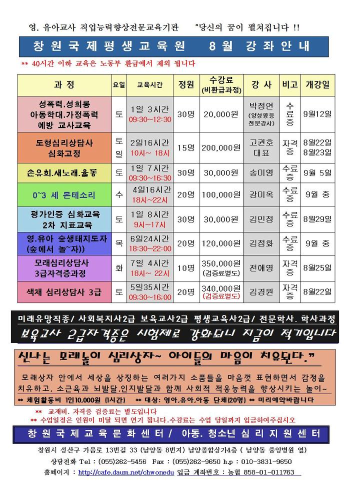 열정의계절 ~ 나를 업그레이드 해요 ~! 작성자창원국제. 평생교육원|작성시간15.07.30|조회수58 목록 댓글 0 글자크기 작게가 글자크기 크게가 첨부파일첨부된 파일이 2개 있습니다. jpg 파일 비환급-국제강좌안내그림001.jpg 다운로드 jpg 파일 비환급-국제강좌안내그림001.jpg 다운로드 다음검색 현재 게시글 추가 기능 열기 북마크 공유하기 신고 센터로 신고 댓글 댓글 0 댓글쓰기 답글쓰기 댓글 리스트