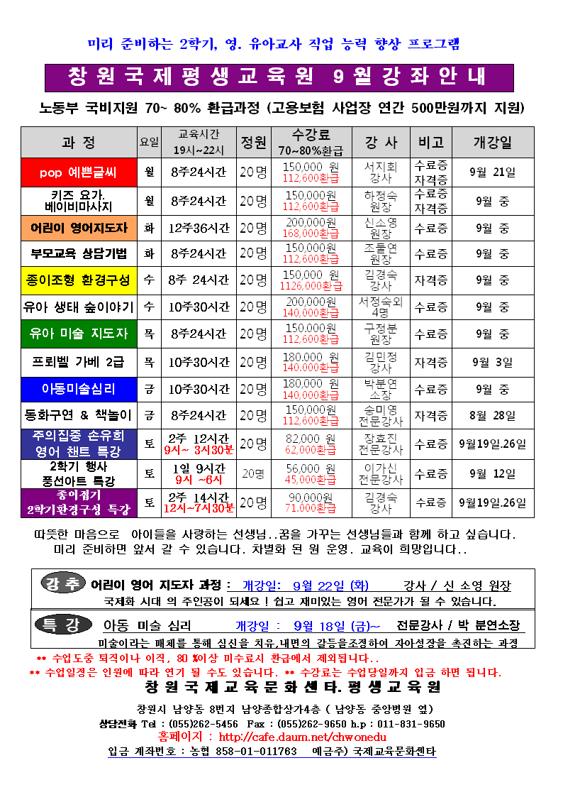 신학기 준비는 지금부터 ** 국제 9월 강좌 안내 작성자창원국제. 평생교육원|작성시간09.08.19|조회수23 목록 댓글 0 글자크기 작게가 글자크기 크게가 차별화 된 경쟁력 !! 자신감있는 교사 ! 앞선 정보와 교육 프로그램 ! 선택하면 길이 보입니다 . 다음검색 현재 게시글 추가 기능 열기 북마크 공유하기 신고 센터로 신고 댓글 댓글 0 댓글쓰기 답글쓰기 댓글 리스트
