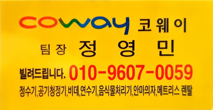 저는 경남 창원에서 코웨이(정수기,공기청정기,비데,침대케어/렌탈 등등) 사업중입니다.