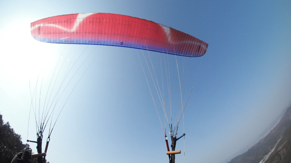 이륙하자 마자 왼쪽 사면으로 열심히 달려갑니다.