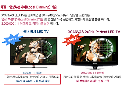 LG전자 홈페이지에 보면 영상부분제어(Local Dimming)라는 것에 대해서는 좀 더 자세히 설명하고 있다. LG전자의 LED TV는 직하형이라서 (화면 크기에 따라) 화면을 80 ~ 240개의 블럭으로 나누어 백라이트를 제어할 수 있고, 이를 통해 2백만대 1의 명암비를 구현한다는 것이다. 반면에 타사(=당근 삼성)의 경우 엣지형이라서 이 Local Dimming이 안되고, 그래서 Black & White 포화 문제가 발생한다는 것이다.
