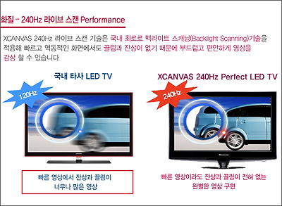 LG디스플레이의 보도자료에 따르면 이번에 새로 개발된 '테두리형 LED 백라이트 LCD 패널'은 "색재현율(NTSC 기준)은 80%, 해상도는 Full HD(1920X1080)로 자연에 가까운 풍부한 색상 구현이 가능하며, 동영상 응답속도 역시 8ms(MPRT)의 120Hz로 눈의 피로감을 줄이면서 잔상 없는 선명한 화질을 제공한다"고 한다. 삼성과 동일한 스펙이다. 그런데, LG전자는 이 120Hz에 만족하지 못하는 모양이다. '잔상과 끌림이 너무나 많은 영상'이라고 폄하하고 있다. 물론, LG전자가 기존에 출시했던 120Hz 패널들도 모두 함께 폄하되고 있지만 말이다.