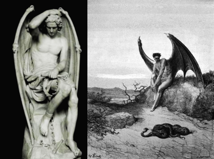 아래왼쪽 대리석조각품은 벨계(België; 벨기에; Belgium; 벨졈) 조각가 기욤 제프(Guillaume Geefs, 1805~1883)의 1848년작 〈악(惡)의 수호신(Le génie du mal)〉이다. 벨계 리에주 생-폴(Saint-Paul de Liège) 성당에 전시된 이 조각품은 영어권에서는 〈리에주의 루시퍼(The Lucifer of Liège)〉라는 제목으로 유명하다. 아래오른쪽 동판화는 잉글랜드 시인 존 밀턴(John Milton, 1608~1674)의 1667년작 장편서사시 《잃어버린 낙원(실락원失樂園)(Paradise Lost)》(1866년판)에 수록된 프랑스 화가·판화가 귀스타브 도레(Gustave Doré, 1832~1883)의 삽화 〈추락한 루시퍼(사탄)〉이다.