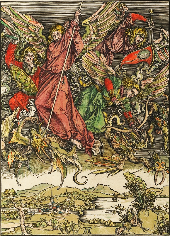 독일 화가·미술이론가 알브레히트 뒤러(Albrecht Dürer, 1471~1528)가 1498년에 완성한 아랫동판화에는 “천국에서 루치퍼(루키페르)를 무찌르는 천사장 미카엘(St. Michael)”이 묘사되었다.