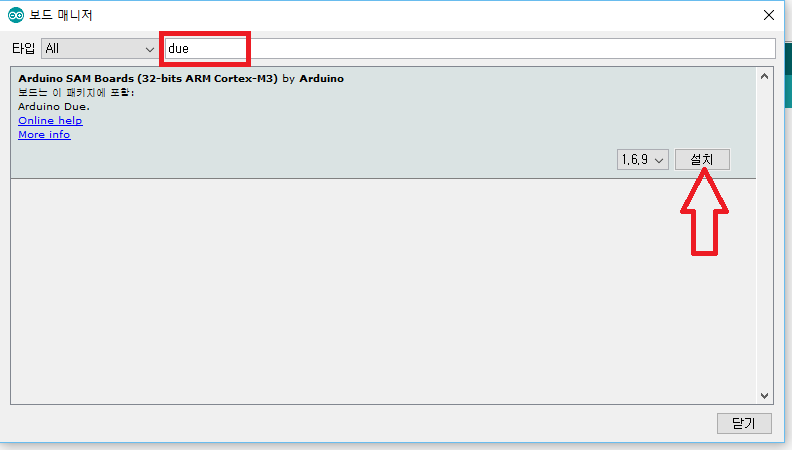 이어서, Arduino SAM Boards (32-bits ARM Cortex-M3) 을 선택하고 "설치"를 클릭합니다.