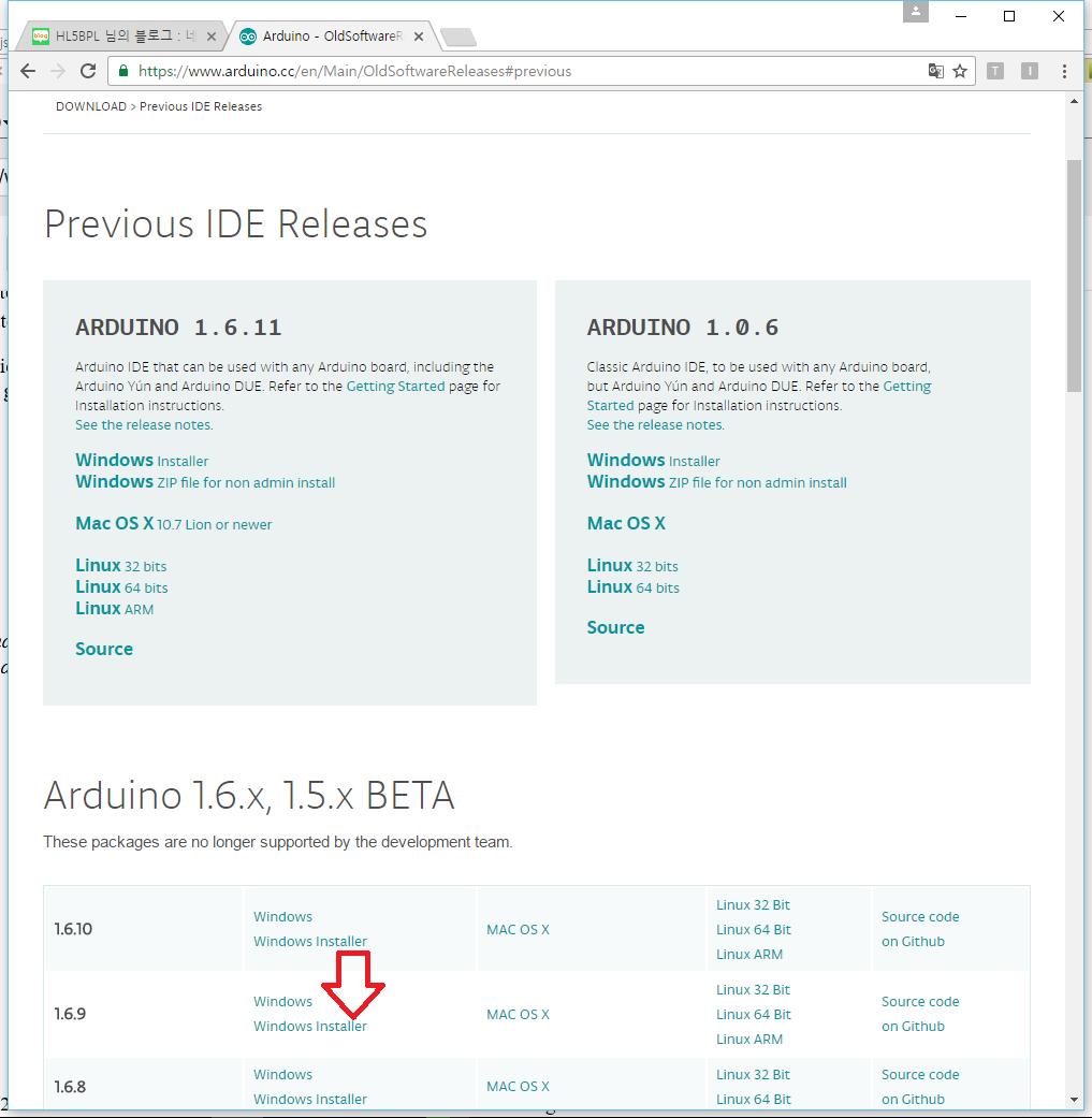 https://www.arduino.cc/ > Download > previous version of current release > 1.6.9 윈도우용 설치프로그램을 다운로드합니다.