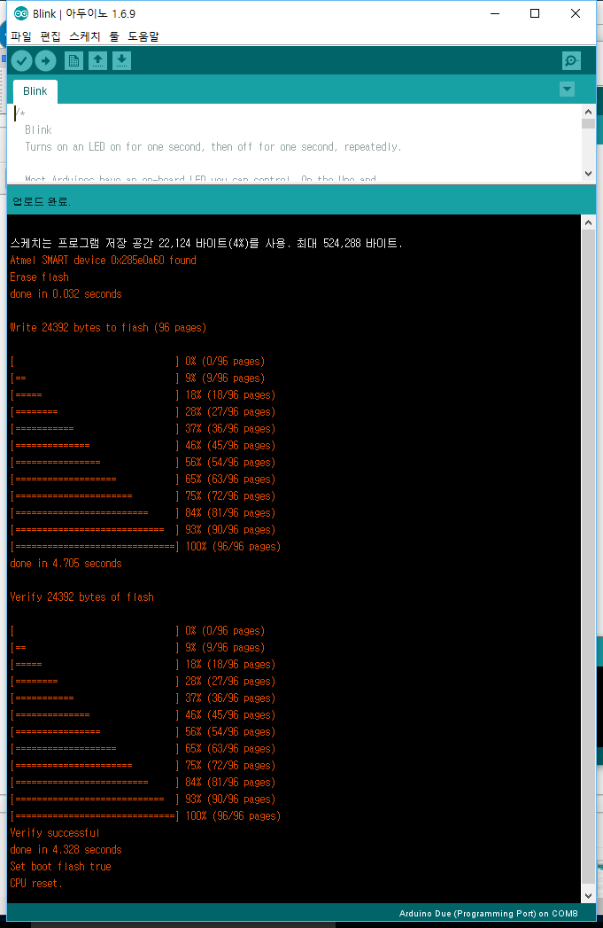 이 테스트 프로그램은 Arduino Due 보드 위의 L LED 를 단지 깜박거리게 하는 것입니다.