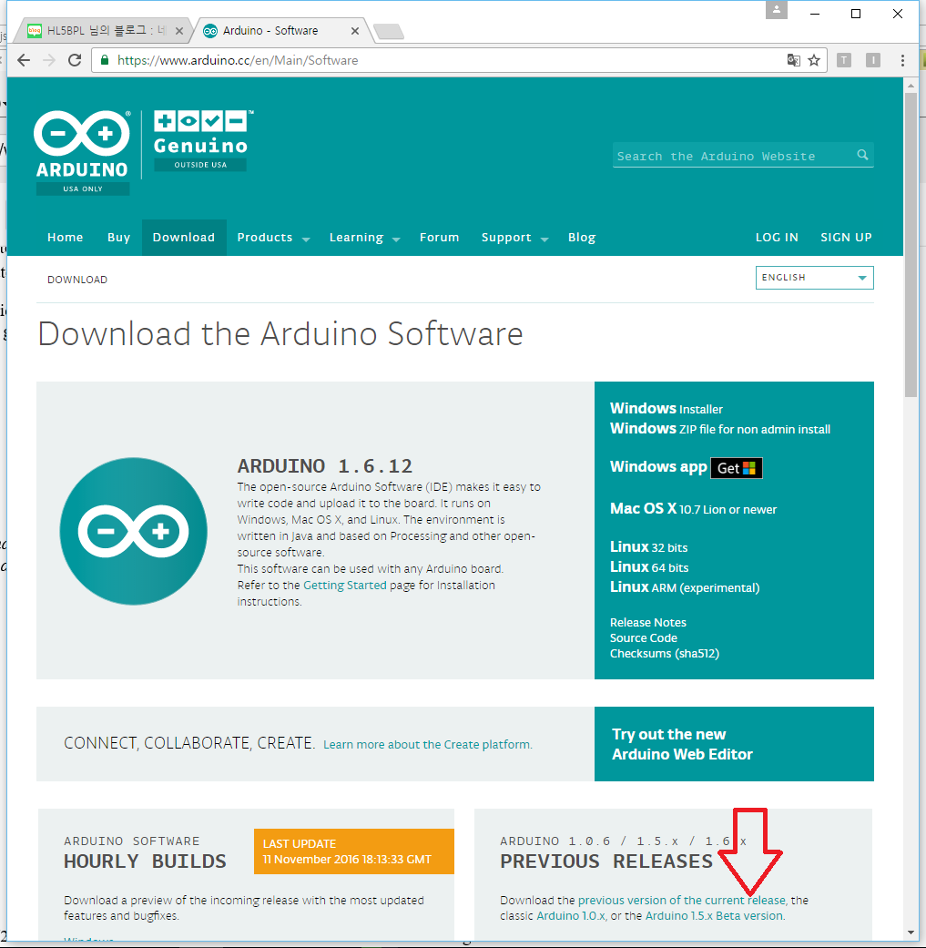 아두이노 다운로드 사이트에 보니 금일 (2016.11.17) 현재 Arduino 1.6.12가 최신판이네요. 여러가지 버전이 있지만