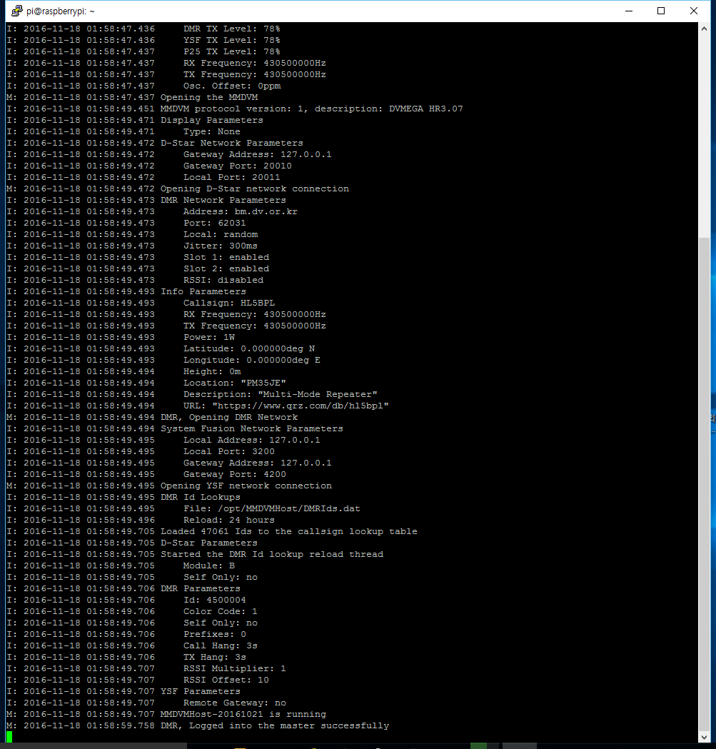 라즈베리파이와 USB Cable로 연결후 다음 그림과 같이 로그 파일이나 screen을 사용해 MMDVMHost 프로그램이 이 정상 기동함을