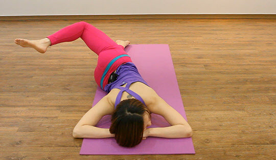 3) 허리를 바닥에 붙이고 무릎을 가슴 쪽으로 당겨준다