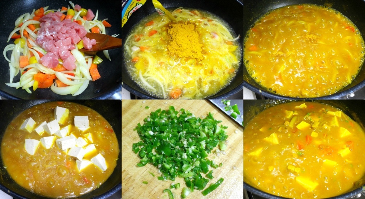 2) 볶은 야채에 물을 붓고 끓이다가 야채가 익으면 카레가루를 넣어 중불로 익혀줍니다.