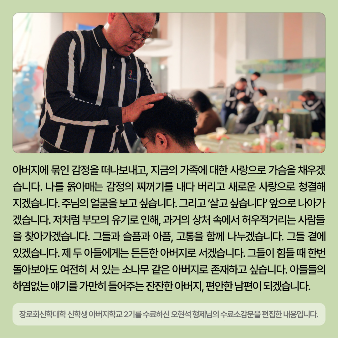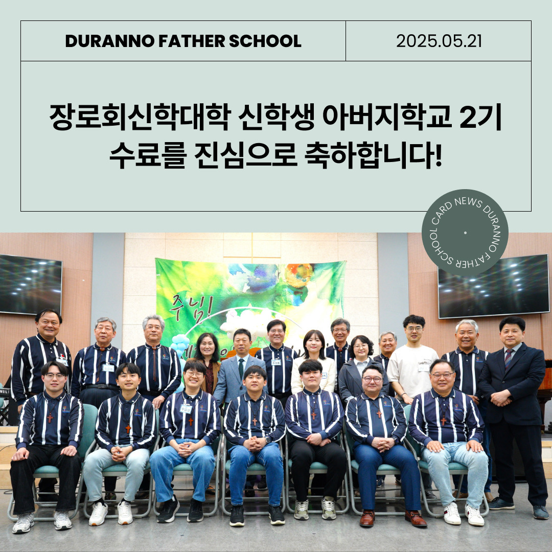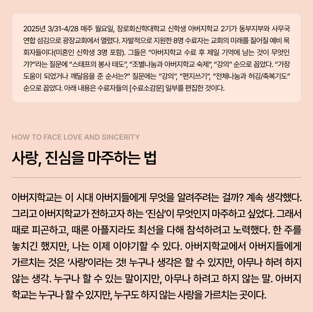 [카드 뉴스]장로회신학대학 신학생 아버지학교 2기 수료를 진심으로 축하합니다! 작성자심인식목사|작성시간25.05.21|조회수5 목록 댓글 0 글자크기 작게가 글자크기 크게가 다음검색 현재 게시글 추가 기능 열기 북마크 공유하기 신고 센터로 신고 댓글 댓글 0 댓글쓰기 답글쓰기 댓글 리스트