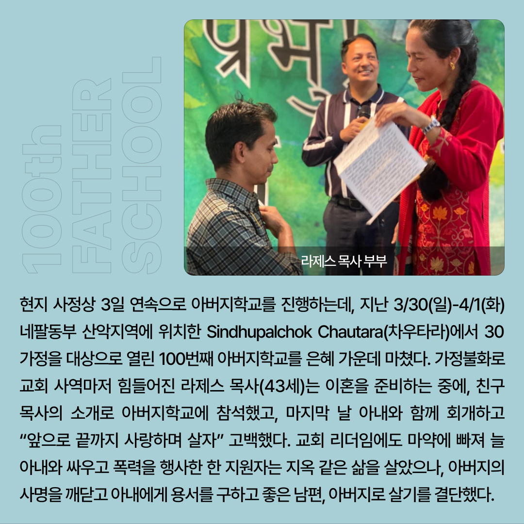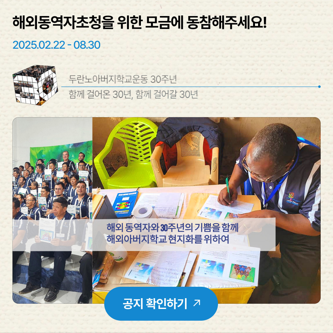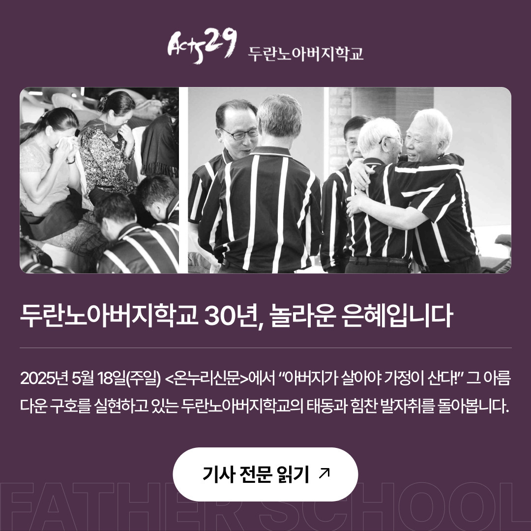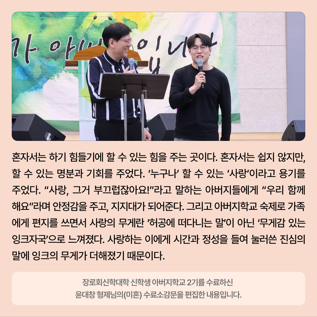 [카드 뉴스]장로회신학대학 신학생 아버지학교 2기 수료를 진심으로 축하합니다! 작성자심인식목사|작성시간25.05.21|조회수5 목록 댓글 0 글자크기 작게가 글자크기 크게가 다음검색 현재 게시글 추가 기능 열기 북마크 공유하기 신고 센터로 신고 댓글 댓글 0 댓글쓰기 답글쓰기 댓글 리스트