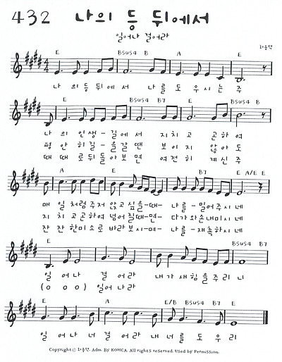 일어나걸어라 / 나의등뒤에서 1. 나의 등 뒤에서 나를 도우시는 주 나의 인생길에서 지치고 곤하여 매일처럼 주저앉고 싶을 때 나를 밀어 주시네 일어나 걸어라 내가 새 힘을 주리니 일어나 너 걸어라 내 너를 도우리 2. 나의 등 뒤에서 나를 도우시는 평안히 길을 갈 때 보이지 않아도 지치고 곤하여 넘어질 때면 다가와 손 내미시네 일어나 걸어라 내가 새 힘을 주리니 일어나 너 걸어라 내 너를 도우리 3. 나의 등 뒤에서 나를 도우시는 때때로 뒤돌아보면 보이지 않아도 잔잔한 미소로 바라보시며 나를 재촉하시네 일어나 걸어라 내가 새 힘을 주리니 일어나 너 걸어라 내 너를 도우리