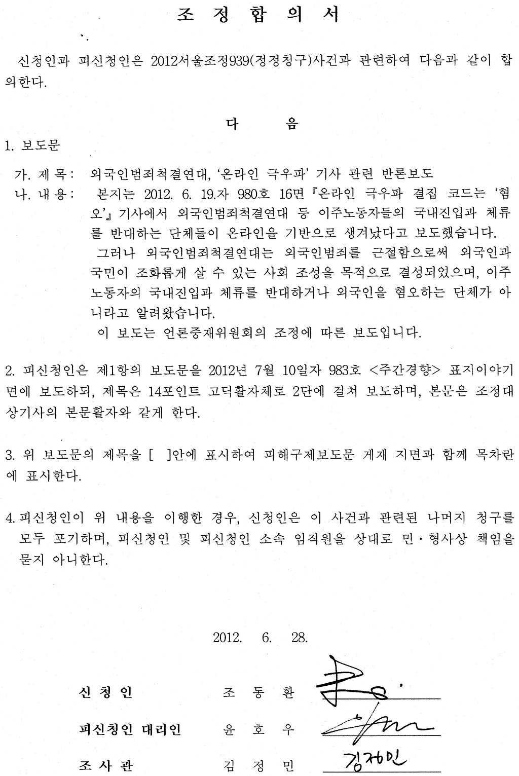 결국 7. 10 주간경향 표지이야기에 정정보도하기로 합의서에 서명하고 마치다.