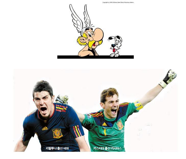 아래 그림을 보면 카스티야 출신 카시야스 골키퍼느 금발이 좀 섞여 있음. 만화 아스테릭스(켈트족)에 좀 더 가까움. 카탈루냐 출신 비야는 라틴족 용모에 가깝고...