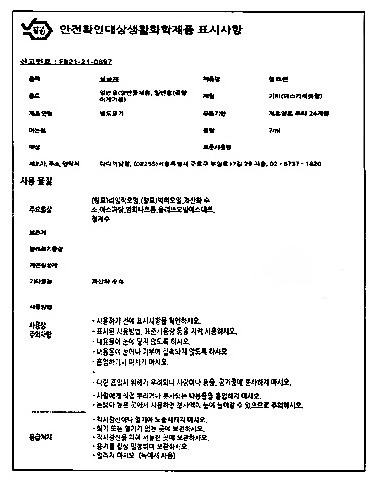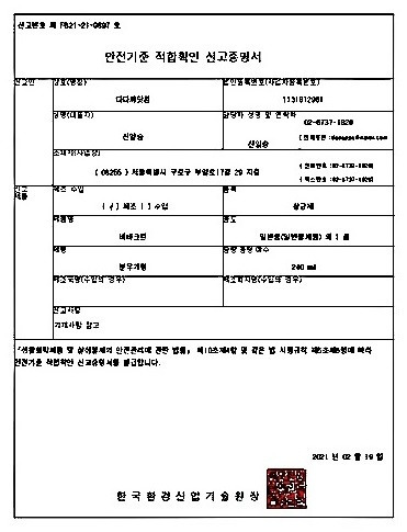 안전확인신고증명서,제FB21-21-0897호 화학제품안전법,살균제 - 점크린