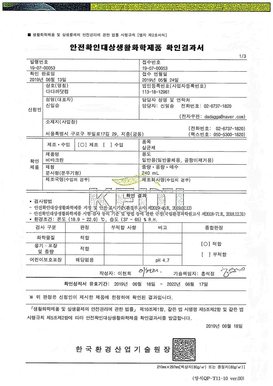화학제품안전법,살균제,,점크린,버바크린,검사성적서,KEITI ,19-07-00053호