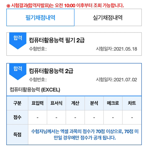필기 같은 경우는 기출만 돌려서 공부하는 분들이 대부분이었는데 저는 이해가 되어야 공부가 가능했기에 균쌤 컴활필기 영상을 하나도 빠짐없이 모두 다 보고 공부했습니다. 이해가 안가는건 이해할때까지 돌려봤습니다. 시험 전 날까지도 기출 2개년 정도만 돌려봐서 걱정이 되었지만, 당당히 합격하였습니다!